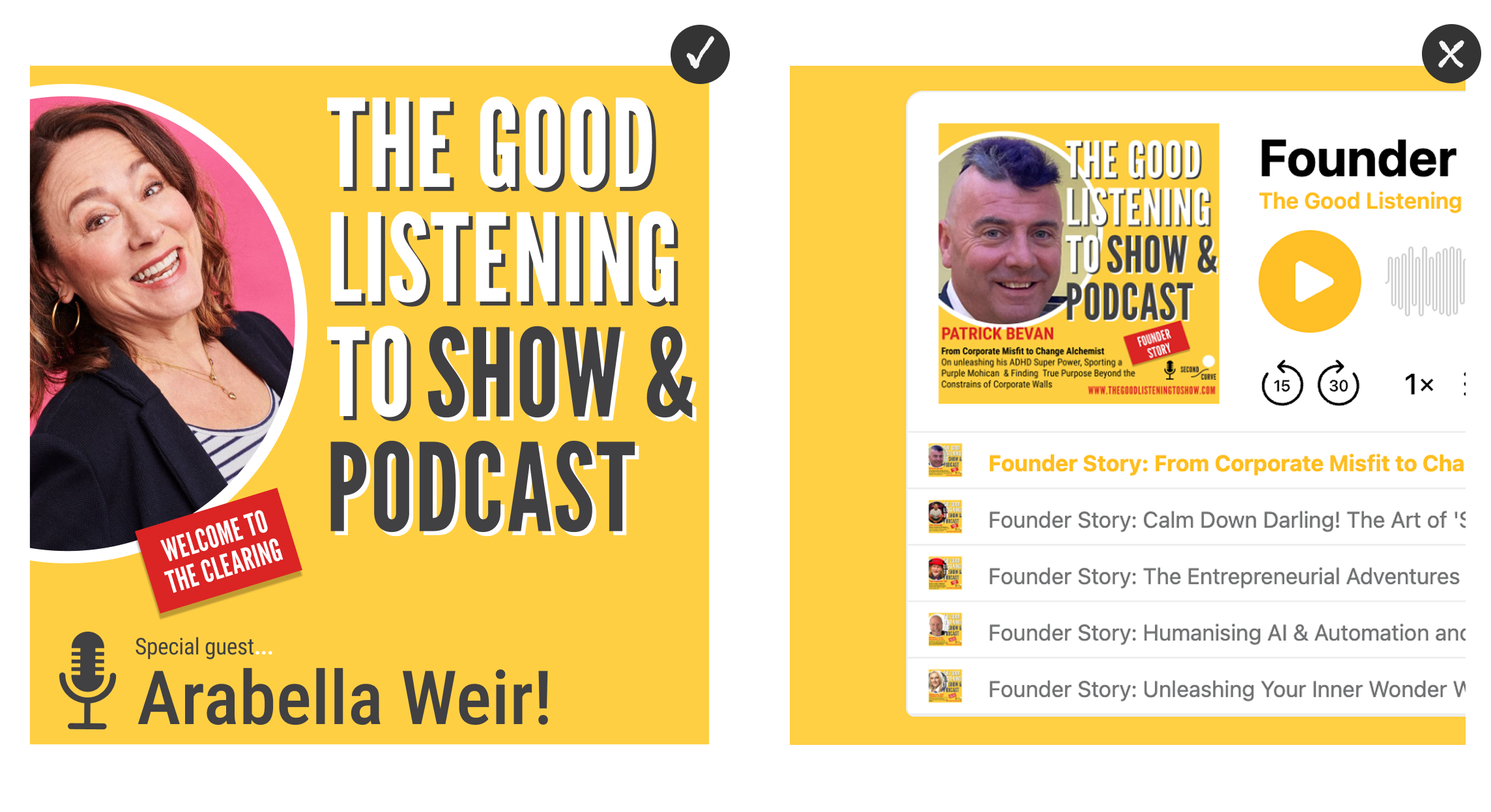 For individual podcast uploads, e.g. on Buzzsprout, an asset with the headshot and name of the guest is used. To have more details about the guests on this asset would make it very difficult to read as an icon, and it doesn't improve SEO.